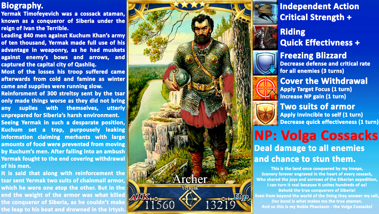 По легенде вместе с подкреплением царь послал Ермаку две панцырных кольчуги, кои он носил одну поверх другой. Но в конце вес этих доспехов и погубил покорителя Сибири, который не смог добраться до отплывающих стругов и утонул в Иртыше.